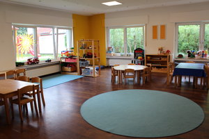 Das Nebenzimmer eignet sich gut für Rollenspiele oder als „Rückzugsort“ für ein ruhiges Spiel. In den vergangenen Jahren haben sich die Bewegungsmöglichkeiten der Kinder in der Tageseinrichtung immer mehr erweitert. Die Aufteilung in zwei Gruppen bedeutet nicht, dass die Kinder nur im Gruppenraum spielen müssen. Die Kinder haben die Möglichkeit sich in der Mehrzweckhalle zu bewegen und in der Eingangshalle kann in Kleingruppen mit Konstruktionsmaterial kreativ umgegangen werden.
