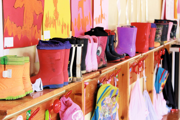 Der Tisch ist bedeckt mit einer Maldecke und lädt zum gemeinsamen Gestalten ein. Eine Pinnwand animiert die Künstler, ihre Produkte aufzuhängen. Kinderbilder sind Spiegel der Seele. Die zum Malen benötigten Kittel hängen an den jeweiligen Haken, in der Nähe des Tisches.